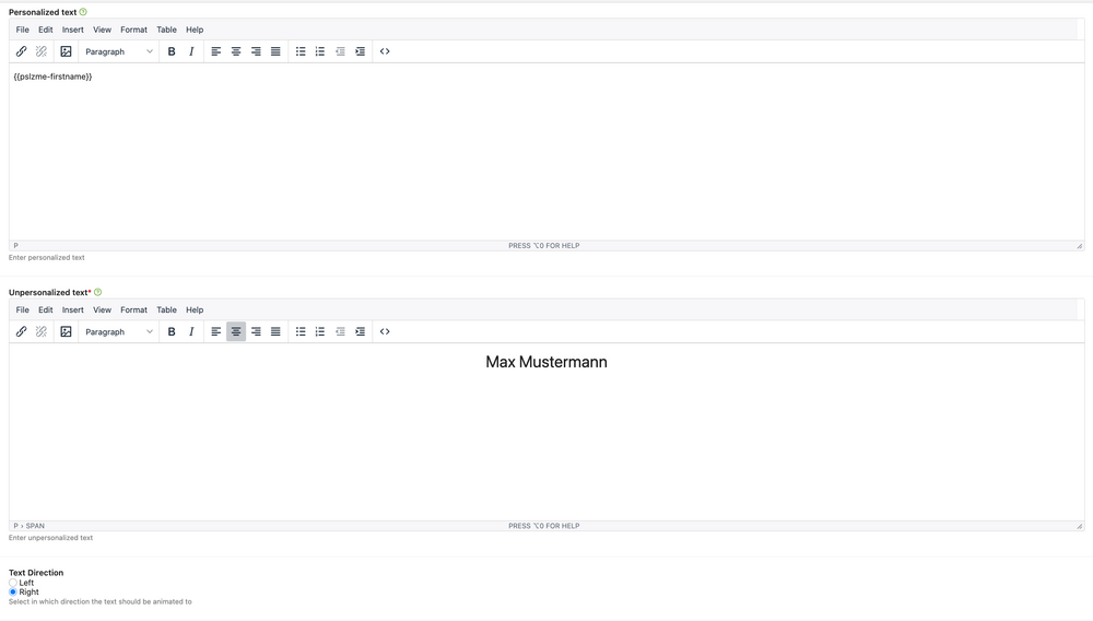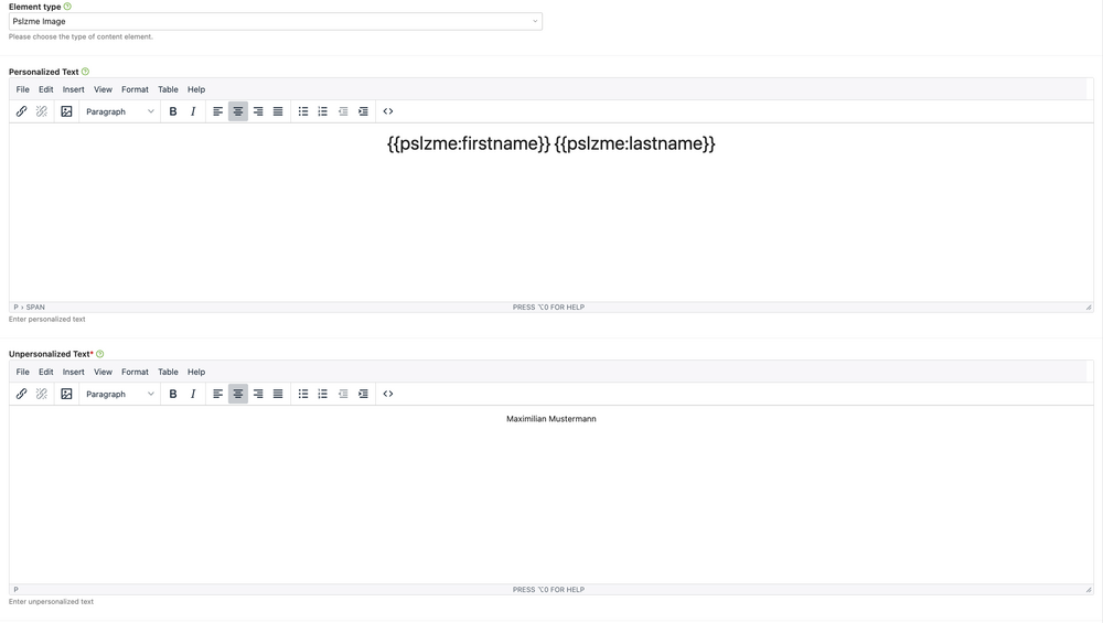 Once you have selected the type, you will again see the familiar text fields for entering personalized and non-personalized text. Here, too, you can use all the familiar insert tags within the personalized text field.