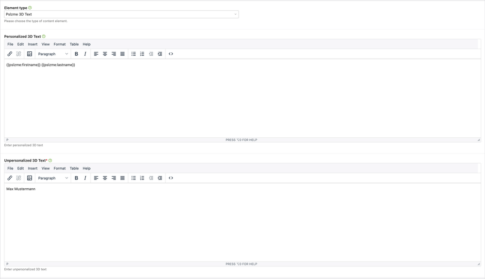 After selecting the type, the two familiar fields for entering personalized and unpersonalized text will appear, as usual. This time, the output of these fields determines whether the generated 3D text—which will ultimately be displayed on the website—contains the personalized or unpersonalized value. Below that, you’ll find three different sections for further configuring the text.