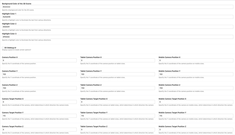 In Block 2, you’ll find various customization options for adjusting the camera settings. To maintain responsiveness, you can specify different values here for the desktop, tablet, and mobile versions. The scene’s camera will then automatically apply the appropriate settings based on the device size. Camera Position X, Camera Position Y, and Camera Position Z determine the exact position of the camera in front of the 3D text. The X coordinate indicates how far to the left or right the text is located, the Y coordinate indicates how far up or down, and the Z coordinate indicates how close or how far away the camera is from the text.