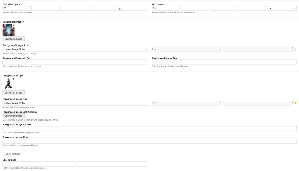 In the next configuration section, you will find two fields used to set different spacing options for your image. The first field determines the spacing between the entire container and other elements on the page. The latter defines the spacing of the previously entered personalized or non-personalized text. This has the advantage of allowing you to position the desired text at an exact location within the combined image to further emphasize the depth effect. In the final configuration section, you will find the selection fields for choosing the two images in question. The first image selected acts as the background layer after combination. This means that the image you select there appears in the backmost layer. The second image selected corresponds to the foreground layer of the combined image. The selected text is positioned exactly between them. Additionally, you can assign a size, as well as a title and alternative text, to the images.